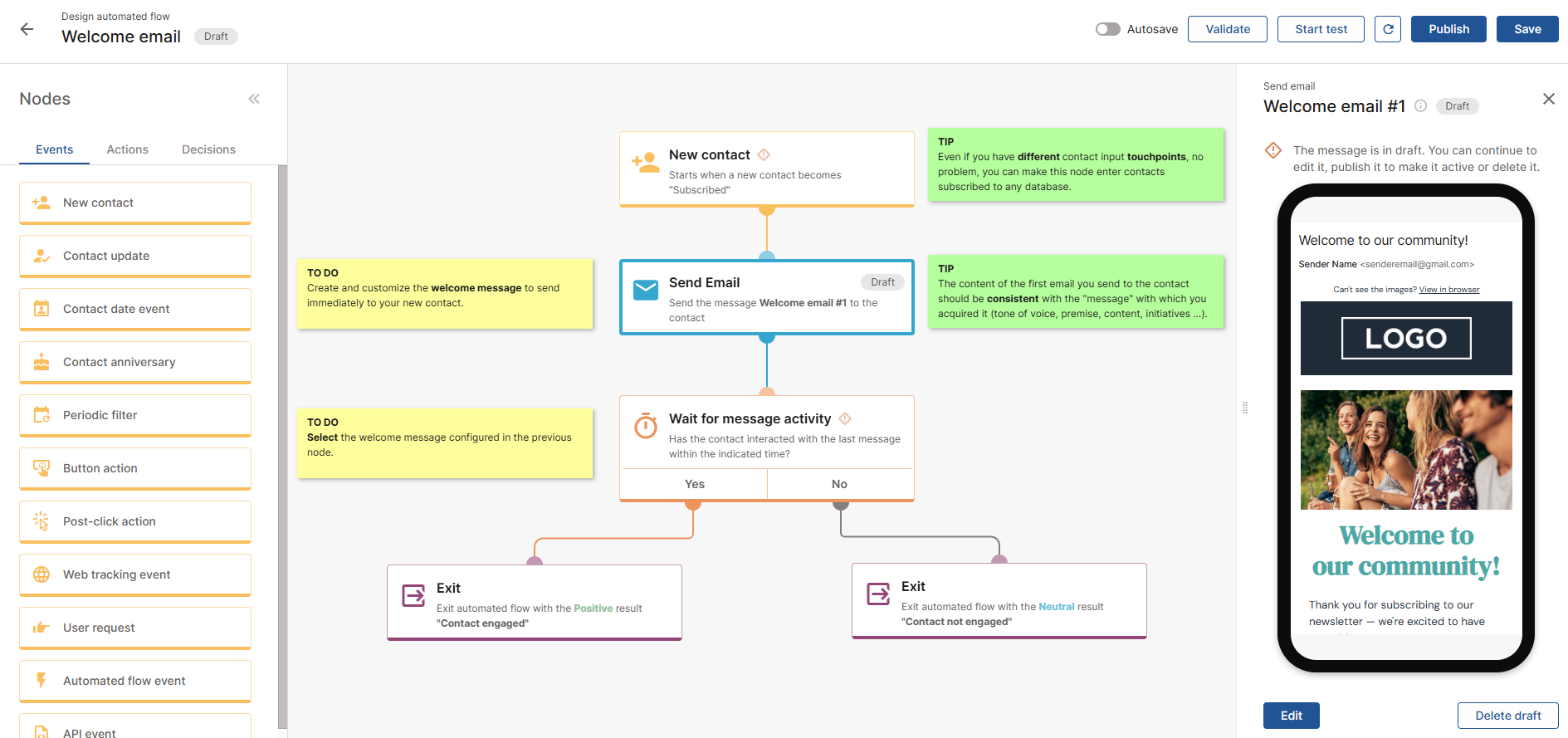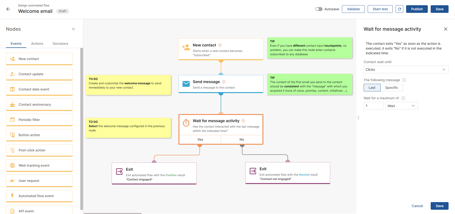 - Think about your strategy. Which contacts are engaged? Where does the flow start, and when does it end? What are the intermediate steps?