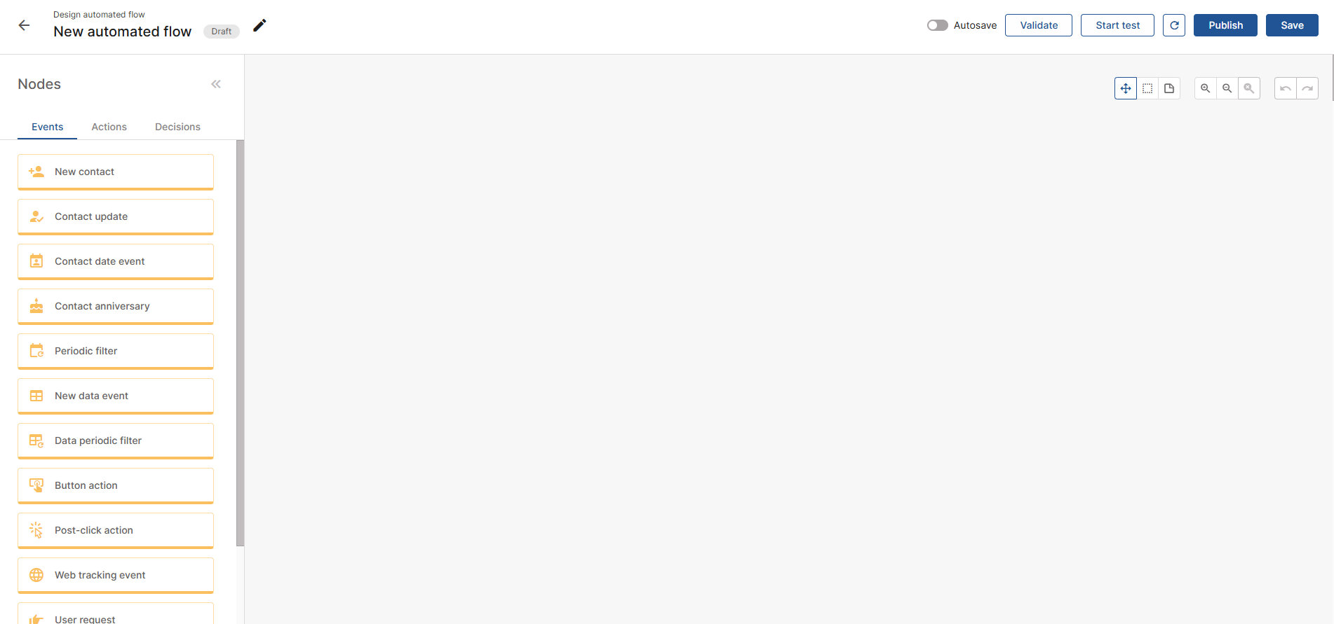 On the right, you have the main actions such as Save, Publish, Start test, and Validate.In the center, you find the board, the space where you drag and connect automated flow components (called “nodes” in magnews) to design the flow step by step.