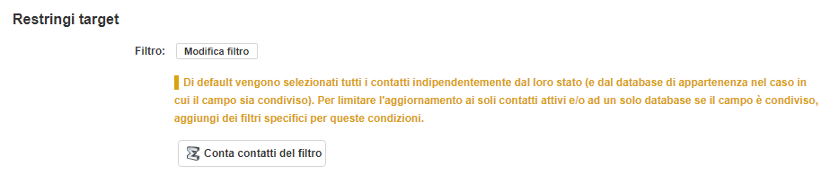 By default, all contacts are selected regardless of their status (and the database to which they belong) if the field is shared. To limit the update to active contacts only and/or to a single database if the field is shared, add specific filters for these conditions.