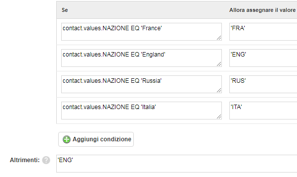 In the If column, write the condition to verify the value of the COUNTRY field:contact.values.COUNTRY EQ 'Italy'