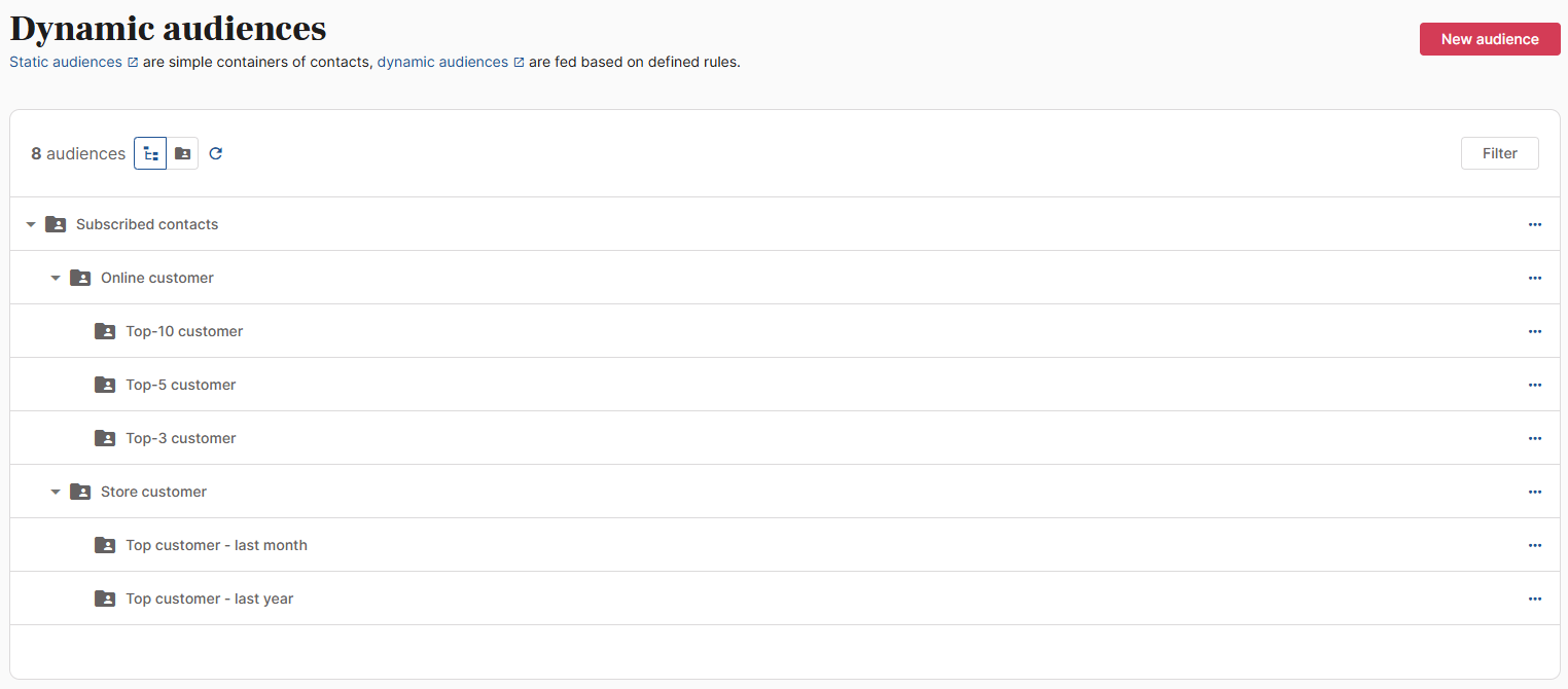 When you create a dynamic audience, you choose the rules according to which your contacts belong or do not belong to the audience, you can think of it as a filter; it is called dynamic because it is self-feeding based on the contacts in the database.