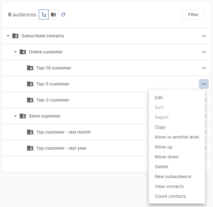 - Reorder audiences on the same level by moving them up or down with the Move up and Move down actions