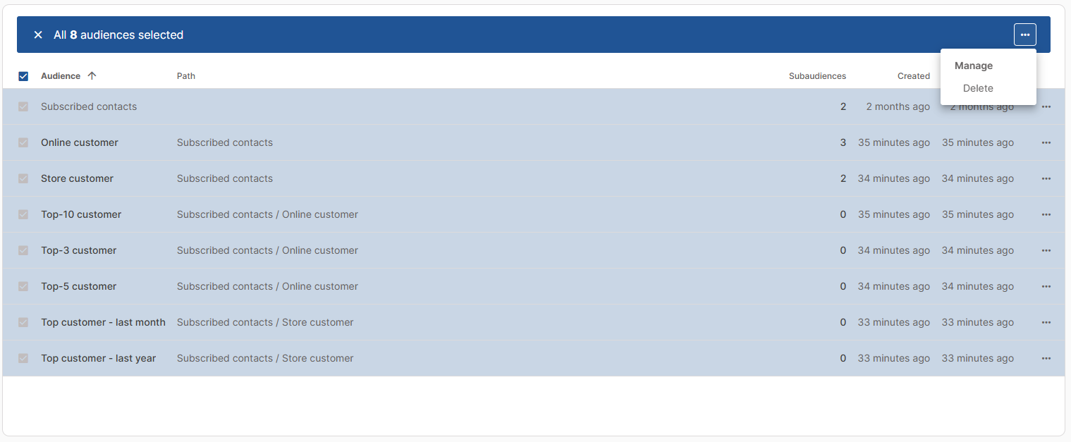 The list view displays audiences in a table, useful for getting a quick overview and managing multiple items at once.