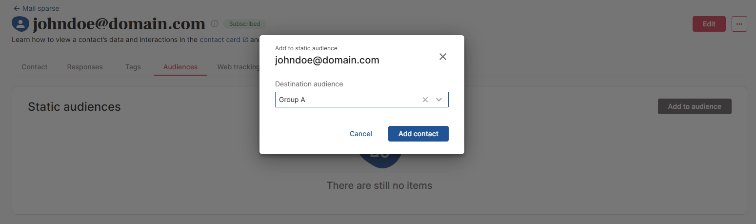 From a contact’s home page, in the Audience tab, click the Add to audience button and choose the static audience where you want to include the contact.