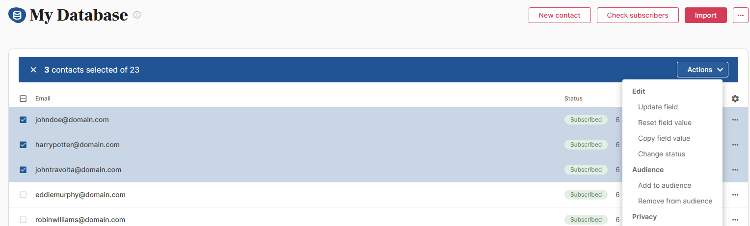 Select multiple contacts at once and choose the option to add or remove them from an audience. You can do this from different areas, such as the Contacts page of a database or by clicking on the Target of a send