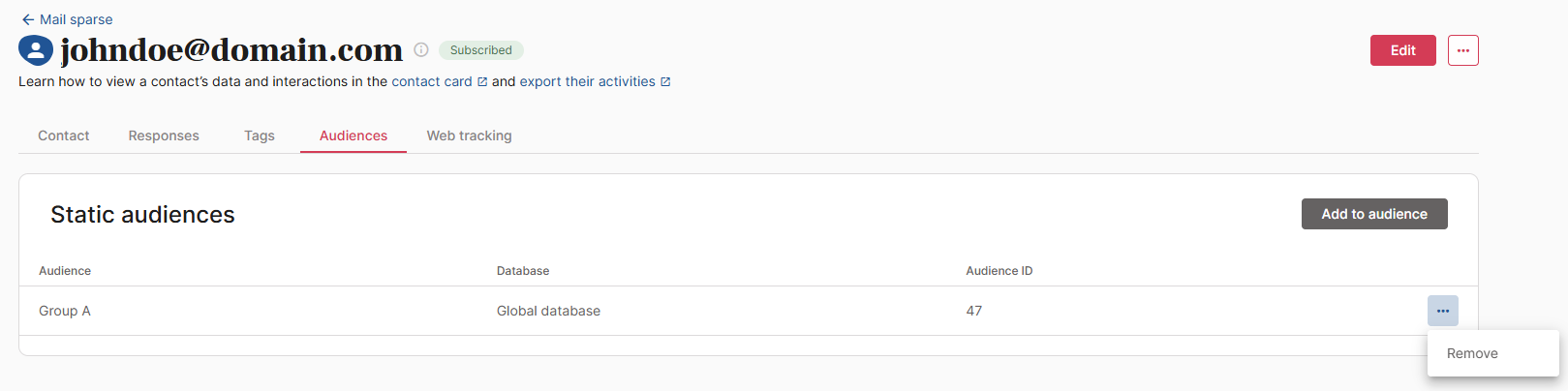 To remove the contact, in the same tab open the three-dot menu on the row of the relevant audience and select RemoveUse the “Add/Remove from audience” action node in an automated flow to manage additions and removals automatically