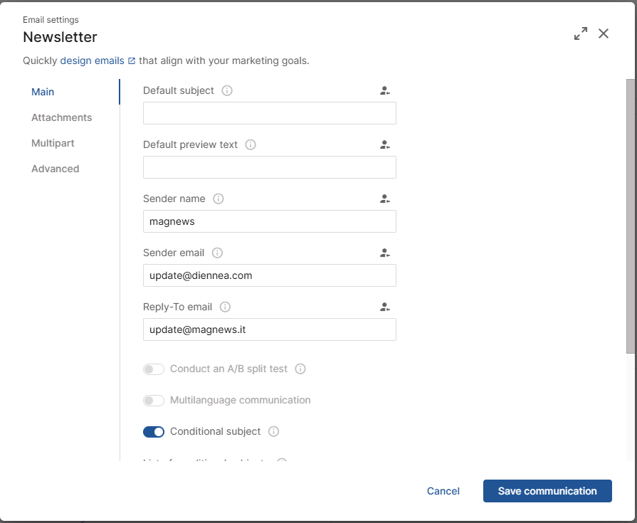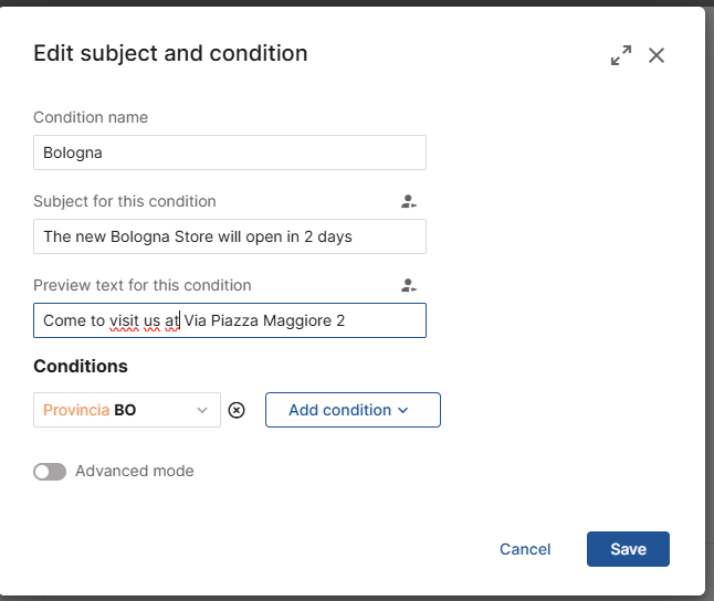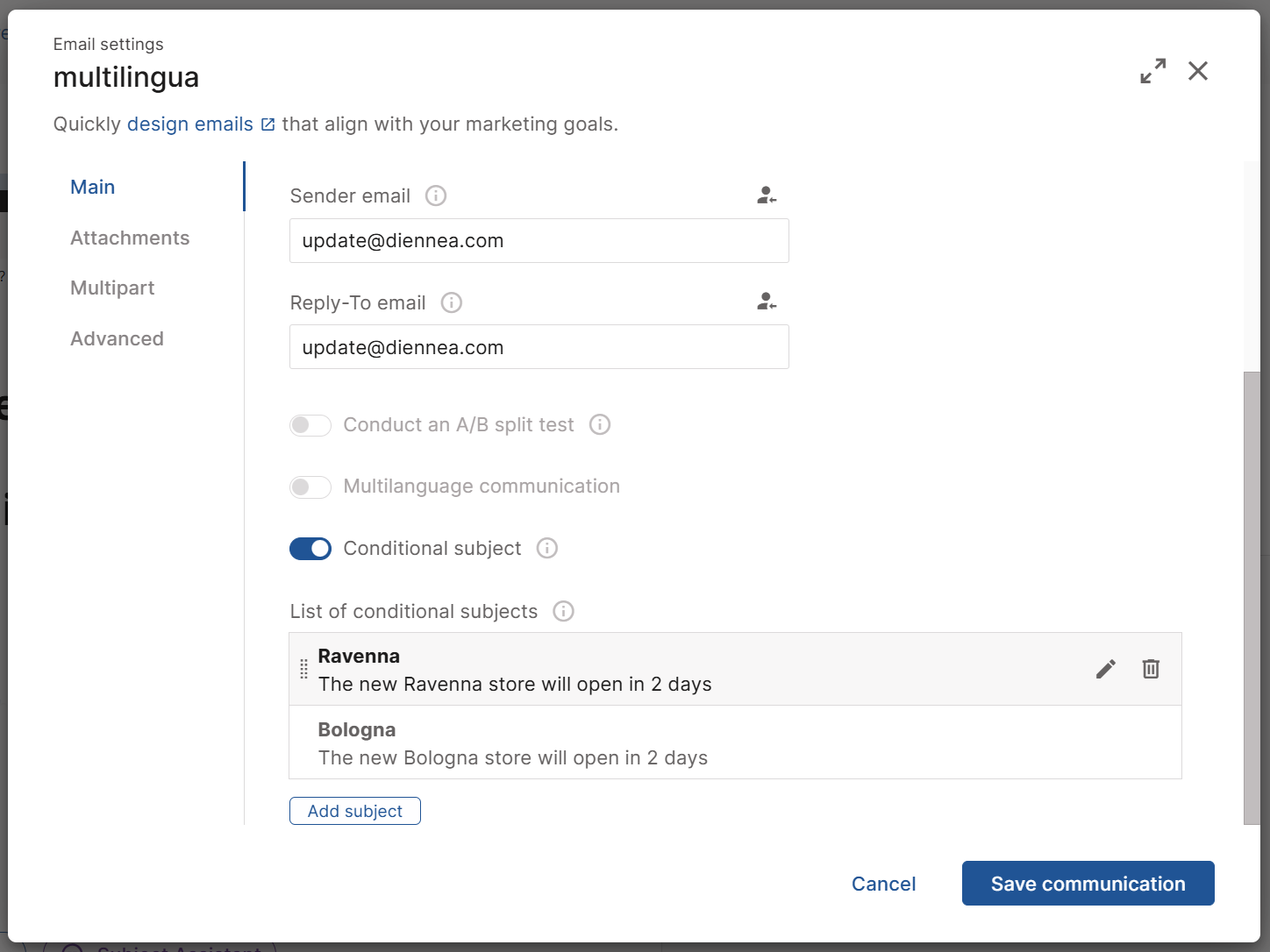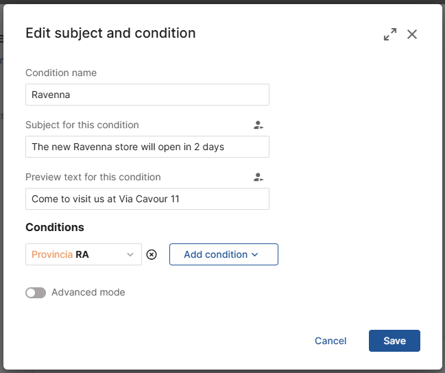 - Click the button Add subject and customize the options by entering the subject, preview text and condition