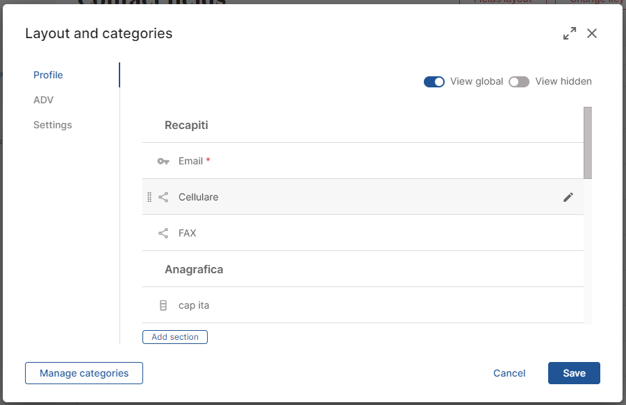 Categories represent the types or origin of the fields and visually will be represented by the Tabs in the contact tab as well as help you in the contact filters.