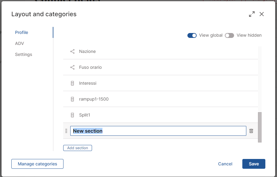 To add a new section click on the Add Section button , in the last position you will be able to edit the text box to change the text.