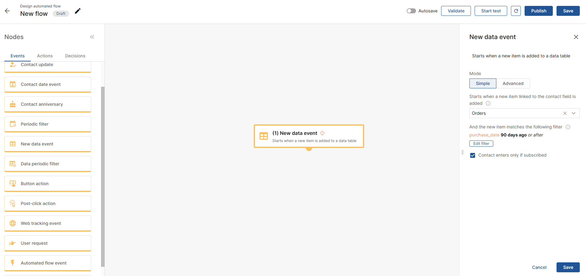 Leverage data tables with the “New data event” and “Data periodic filter” nodes