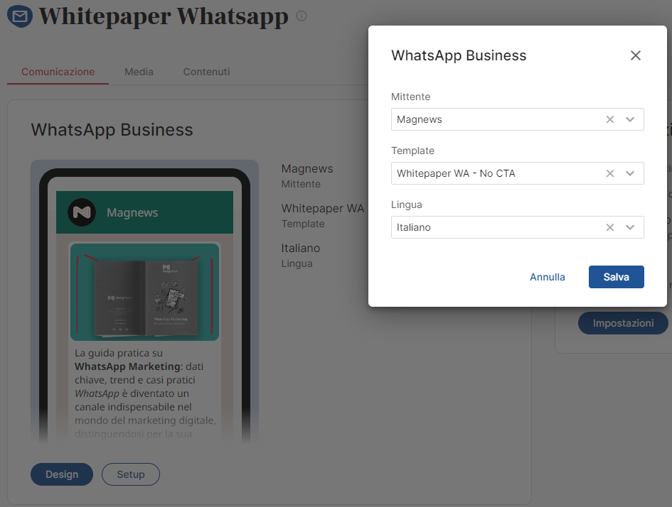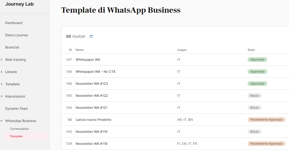 With the WhatsApp Business solution directly integrated on magnews, you can manage the entire life-cycle of templates, from creation to modification, to approval, directly on the platform in the Template section accessible from the menu Journey Lab > WhatsApp Business.