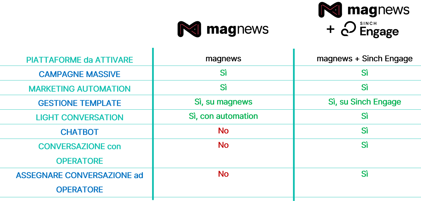 Yes, the two solutions are not alternatives to each other but can coexist on the same magnews account, provided that two different WhatsApp numbers are used: one for the direct part, managed with the direct channel integrated on magnews, and the other for the relational and conversational component, managed and integrated with Sinch Engage.