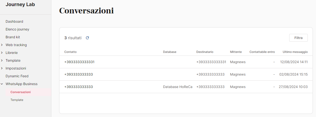 WhatsApp Business, directly integrated with magnews, does not allow for direct management of conversations by an operator. You can view ongoing conversations and message exchanges but cannot respond manually to contacts.