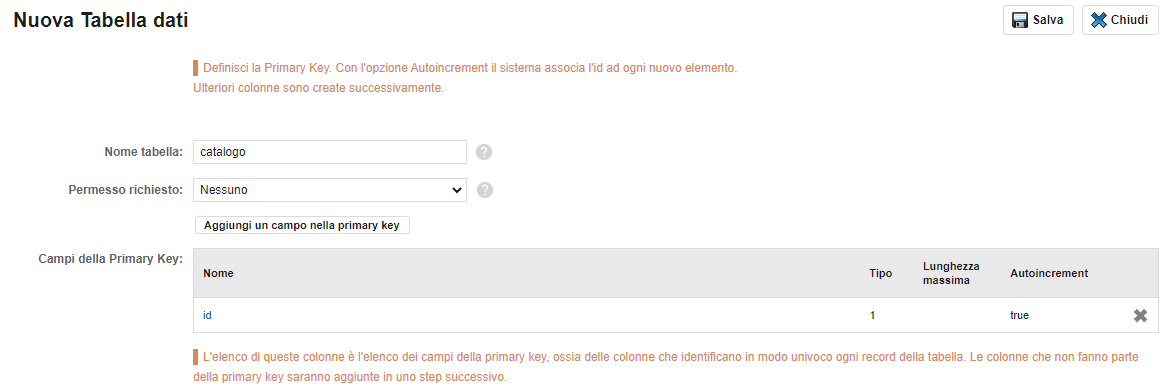 - Set the primary key by adding a field called "id" of type Integer (4 bytes) with Auto-increment and Ascending order options.