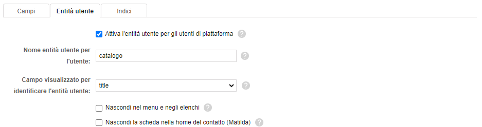 Once all the useful fields are configured, go to the User Entities tab, activate the flag and indicate the display field to identify the entity (normally "title", the product name).