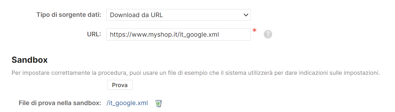 In the next step, select Download from URL as the source type, and specify the URL of the Google Shopping feed. Save and test the configurations set.