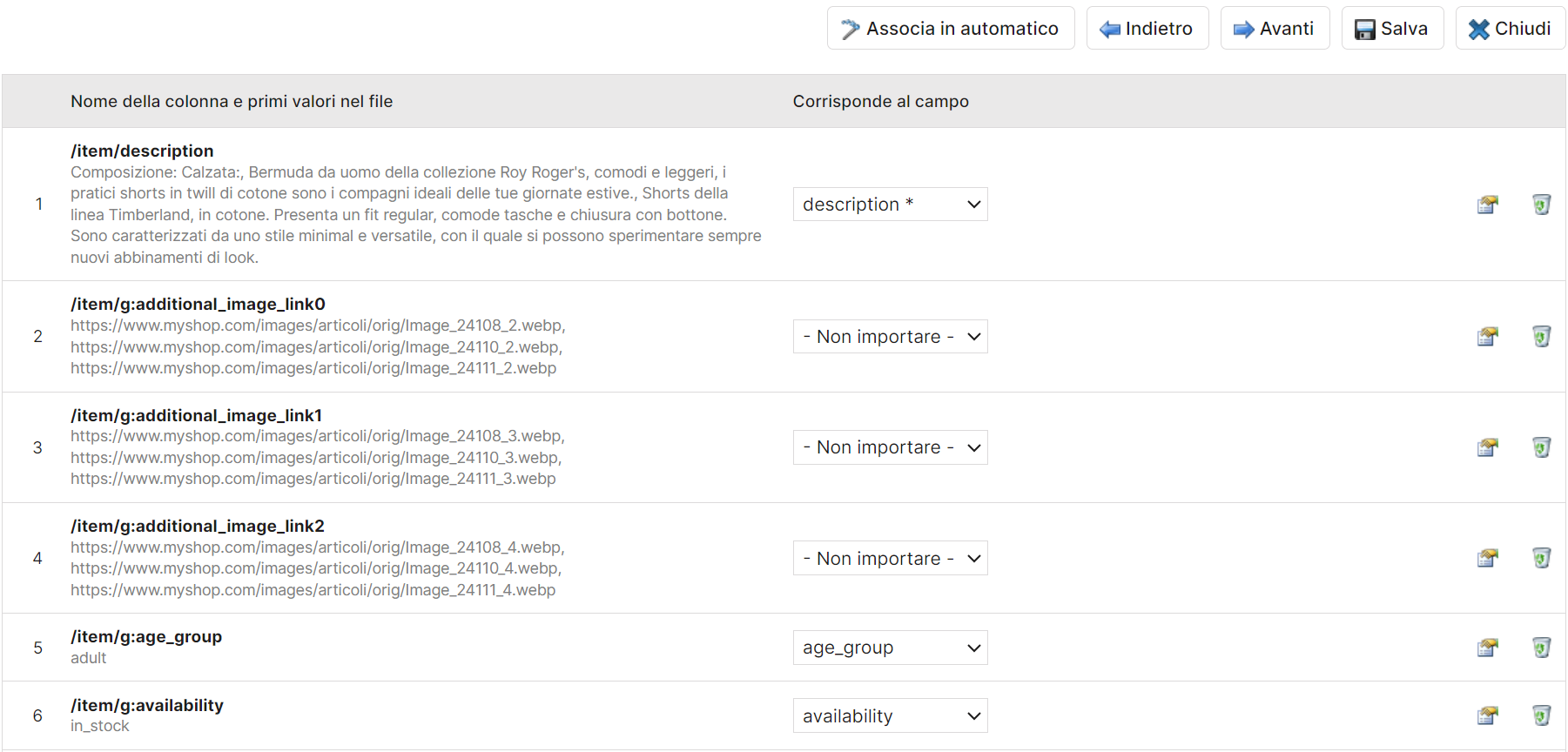 Map the product attributes in the feed with the attributes of the catalog table. You can choose not to import certain attributes if they are not needed. Magnews provides examples of values present for each feed attribute.