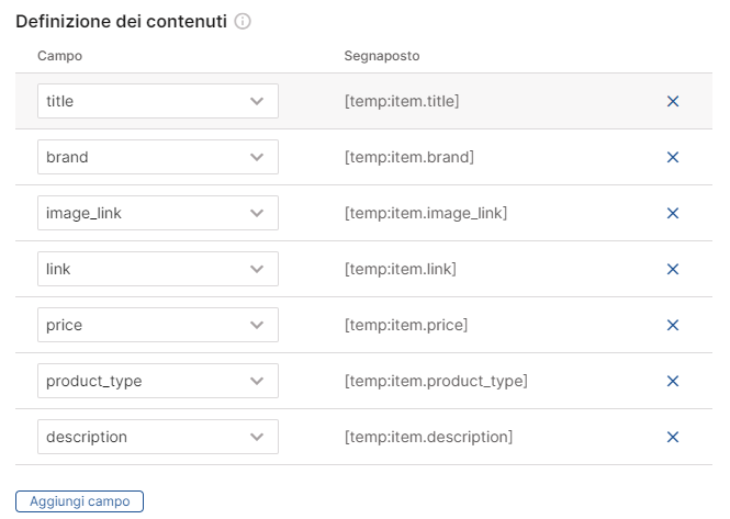 Next, indicate which table attributes you want to use in your custom objects. For the products, information such as title, price, description, category, image, and link to the product page are essential. You can customize the feed by adding other attributes present in the table.