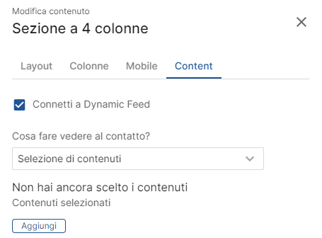 After correctly linking the content, go to edit the entire section. In the Content tab, ensure the content is connected to the Dynamic Feed. In the What to show the contact selection, set the option Content selection and click Add.