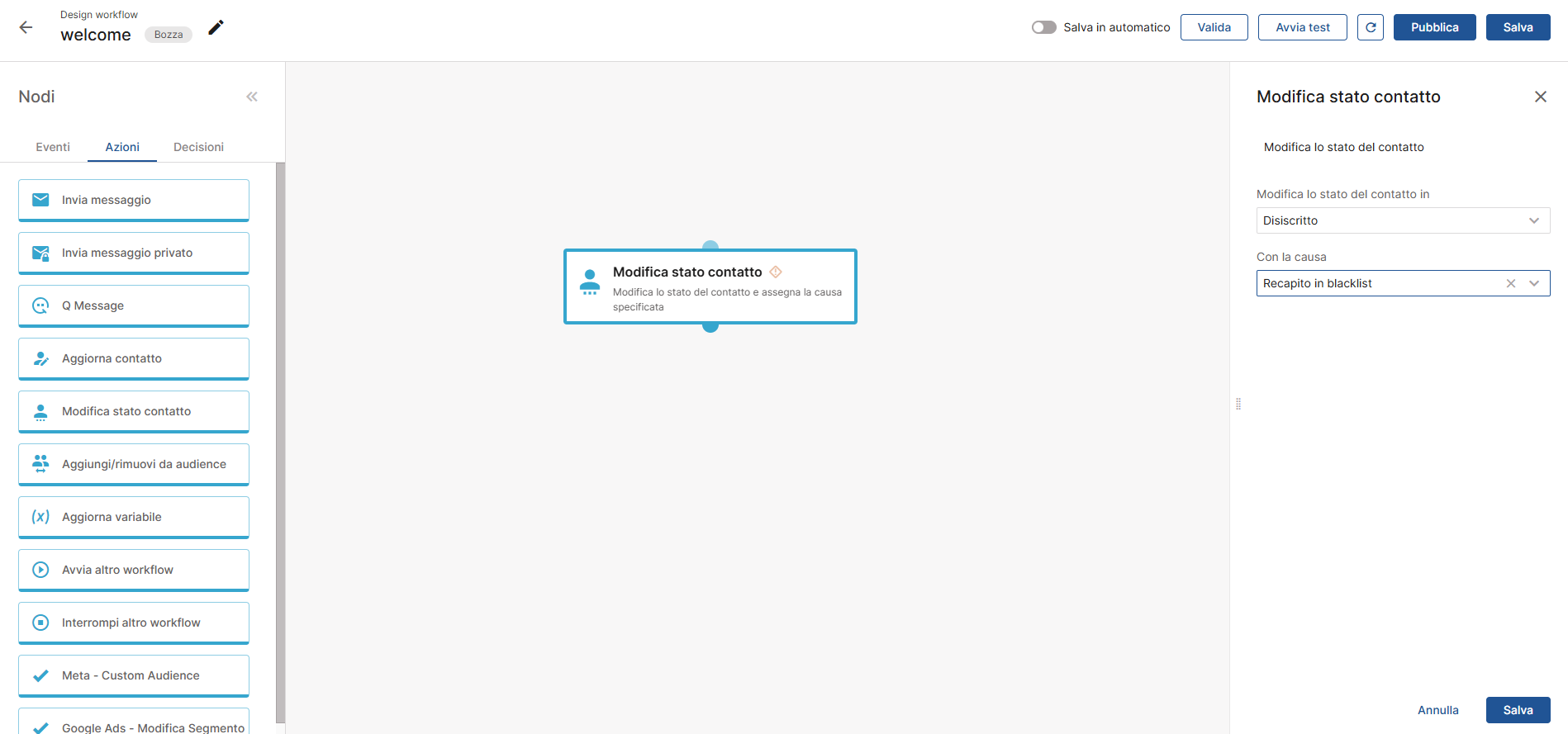 Update the value of a contact field within a workflow using the “Update contact” node, or change the contact status with the “Change contact status” node.