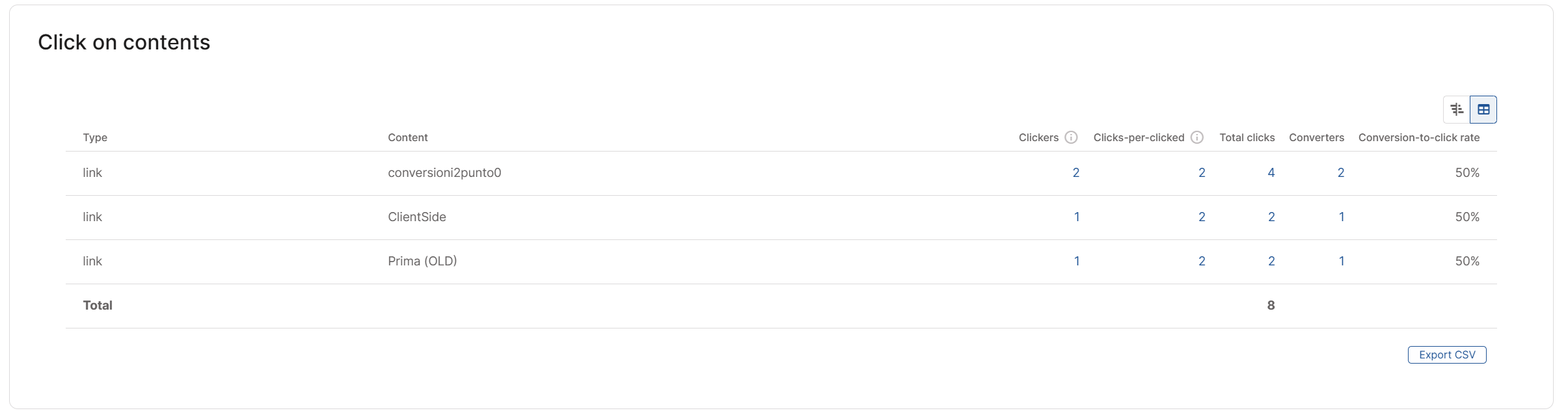 “Performance” view, where for each content you will see columns for the content name (e.g. Oltremare, Acquafan), the total number of clicks received, and finally the click rate (percentage of emails clicked compared to those delivered) and the conversion rate.