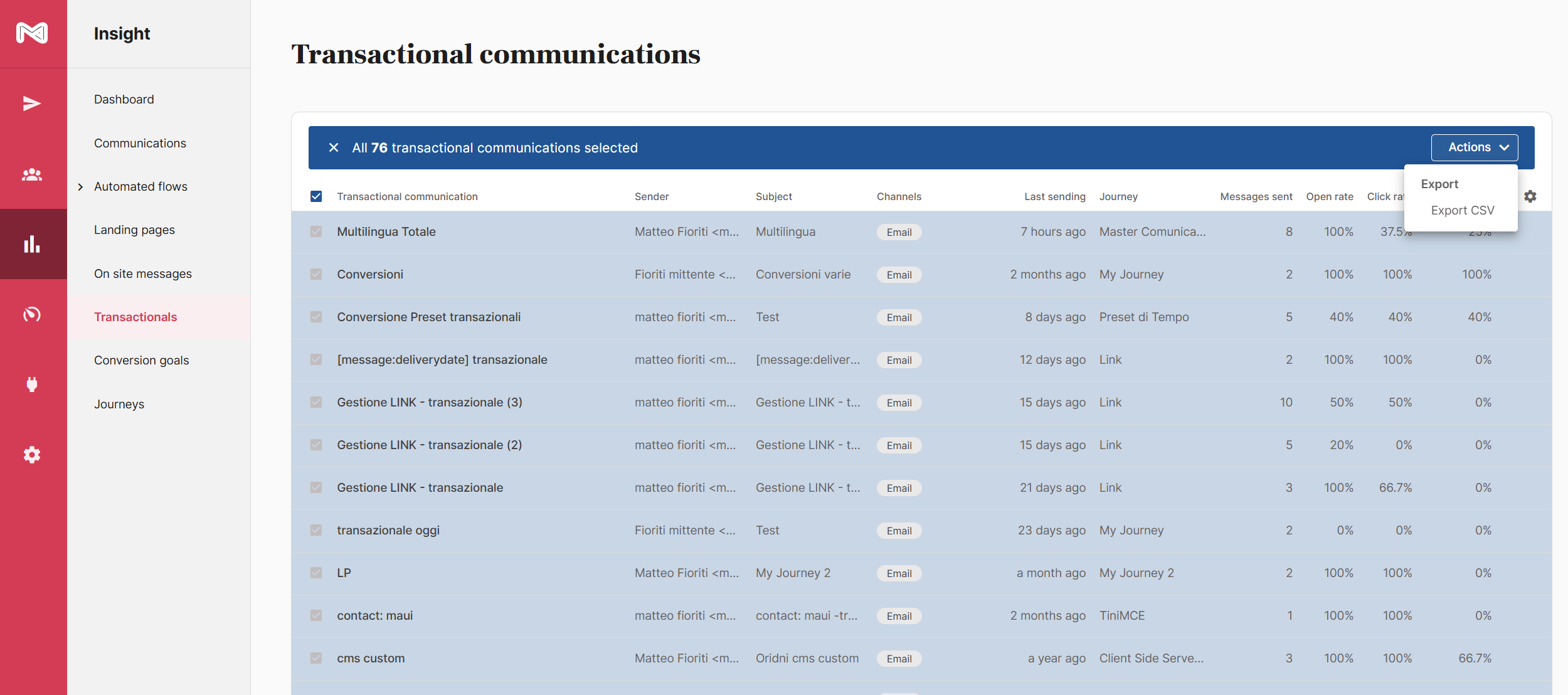 By accessing the Insight > Transactional section, you’ll find the list of all communications sent with the main performance indicators such as open rate, click rate, conversion rate, last send date, channel used, and related journey.