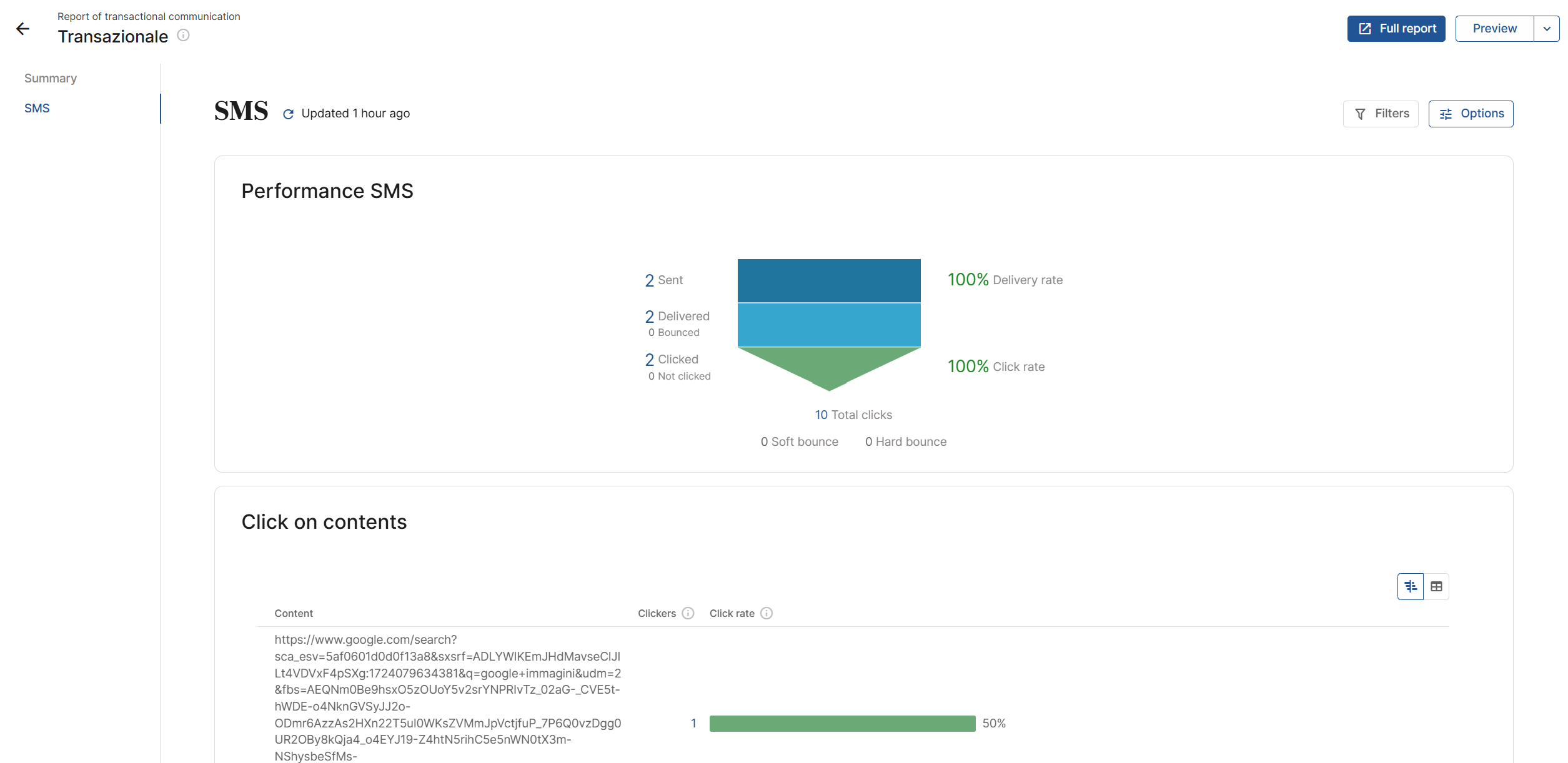 If the transactional message also (or only) uses the SMS channel, the "SMS" section appears, which includes a dedicated funnel and related reports to analyze the specific metrics of this channel (sent, delivered, clicked, ...).