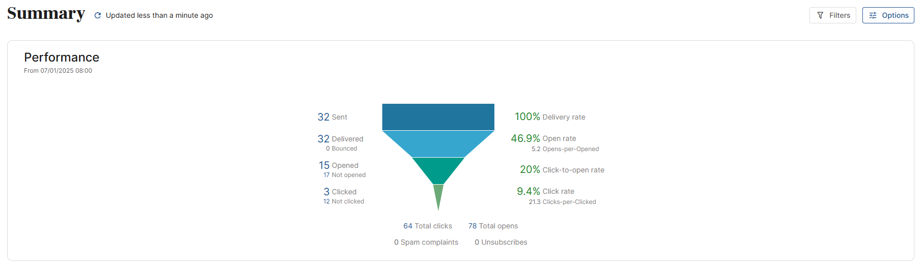 In the "Summary" section, the main KPIs and values are visually represented, grouped into a funnel report. In just a few seconds you can check the delivery rate, number of opens, clicks generated, and the results in terms of conversions. If the communication led to a purchase or a specific action, you will also find the total and average value generated. This way you immediately get a sense of the overall effectiveness of the message.