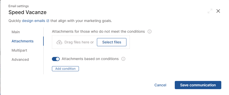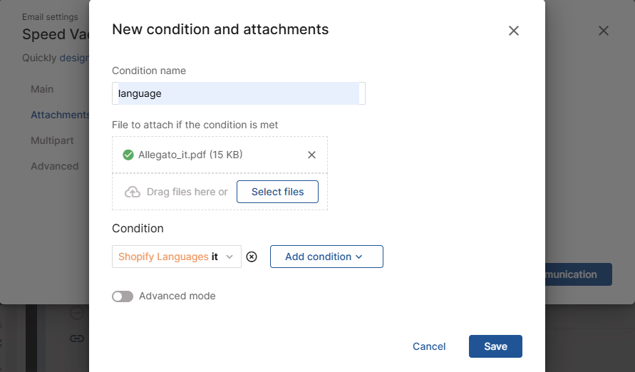- You can define different attachments for each condition (e.g., a PDF in Italian for Italian users, one in English for English users).