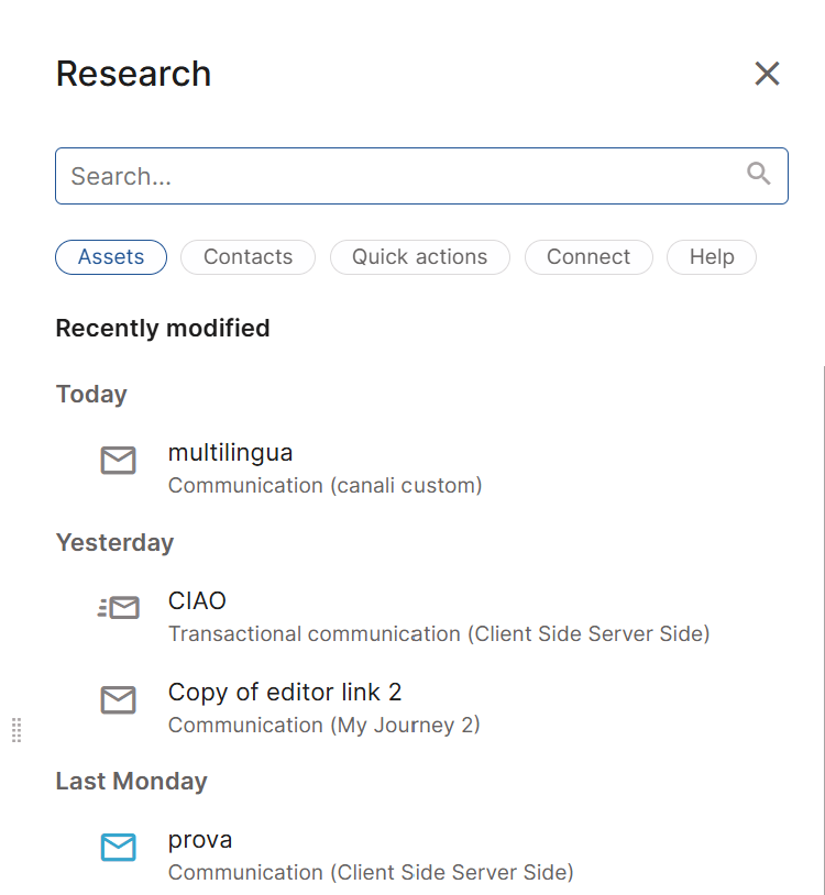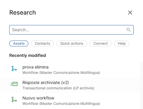 Choose where to search:- Assets: includes newsletters, workflows, and generally any item grouped in Journey Lab.