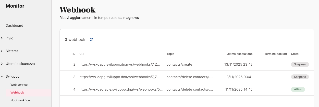 Webhooks are a mechanism that allows magnews to automatically send notifications to external systems whenever a specific event occurs (for example, when a contact is created or an email is opened).