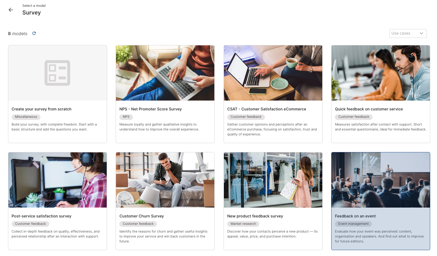 Need to create a new survey but don't know where to start? Whether you already have questions in mind or are looking for inspiration, pre-configured models allow you to get started faster and provide you with a set of ready-to-use questions.