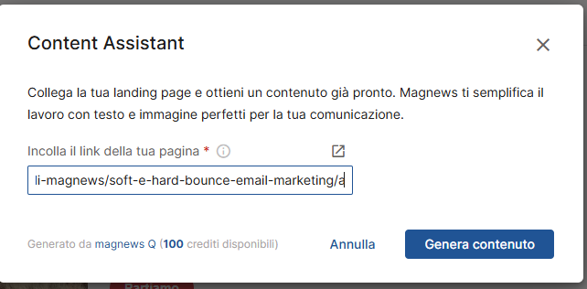Insert the section → click the Q icon → enter the landing page URL → click Generate content.