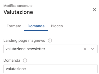Configuration → in the Question tab, choose the landing page (must be active) and specify the related question (insert the “name” attribute visible in the Code tab).