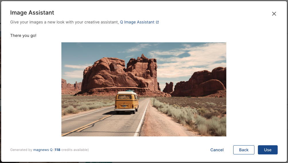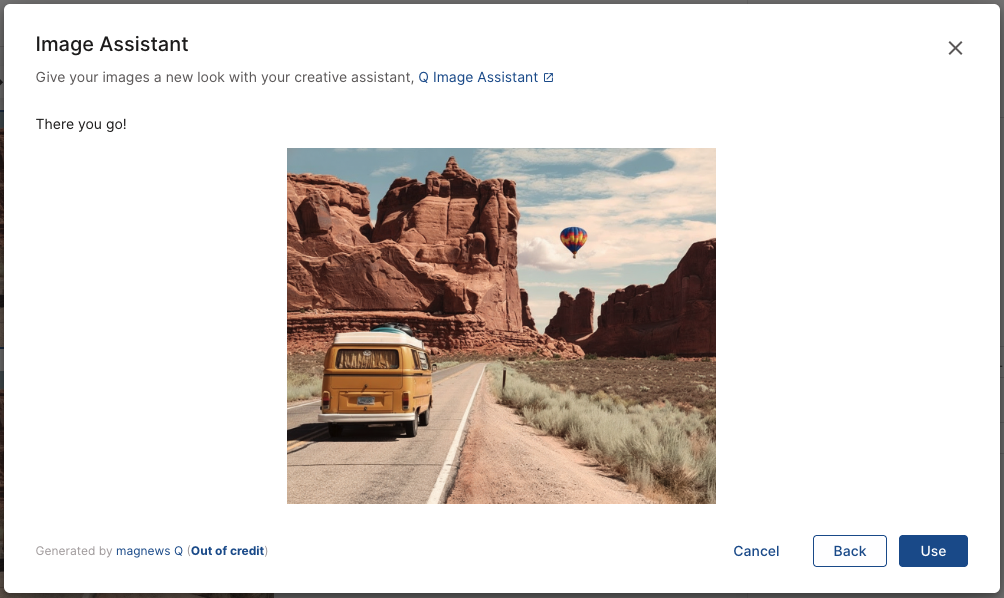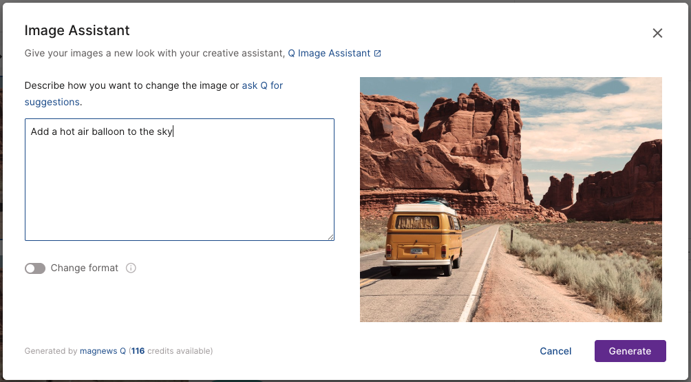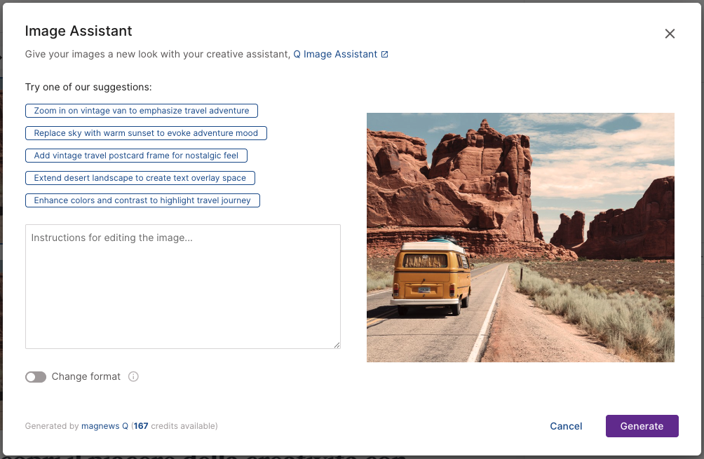 You will find the purple Q Image Assistant icon: click on it to open the dedicated window. Here you can write instructions describing what you want to change, or ask Q for ready-made suggestions.