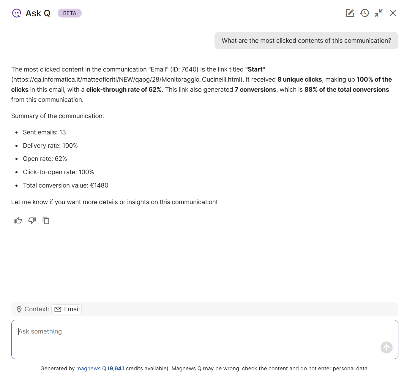 Ask Q is not just a chat for asking generic questions about the platform, but a conversational interface that understands the context you’re working in and helps you analyze data, interpret results, and make operational decisions. Depending on whether you’re working on a communication, a journey, or an automated flow, the chat adapts responses, suggestions, and analyses to the specific context.