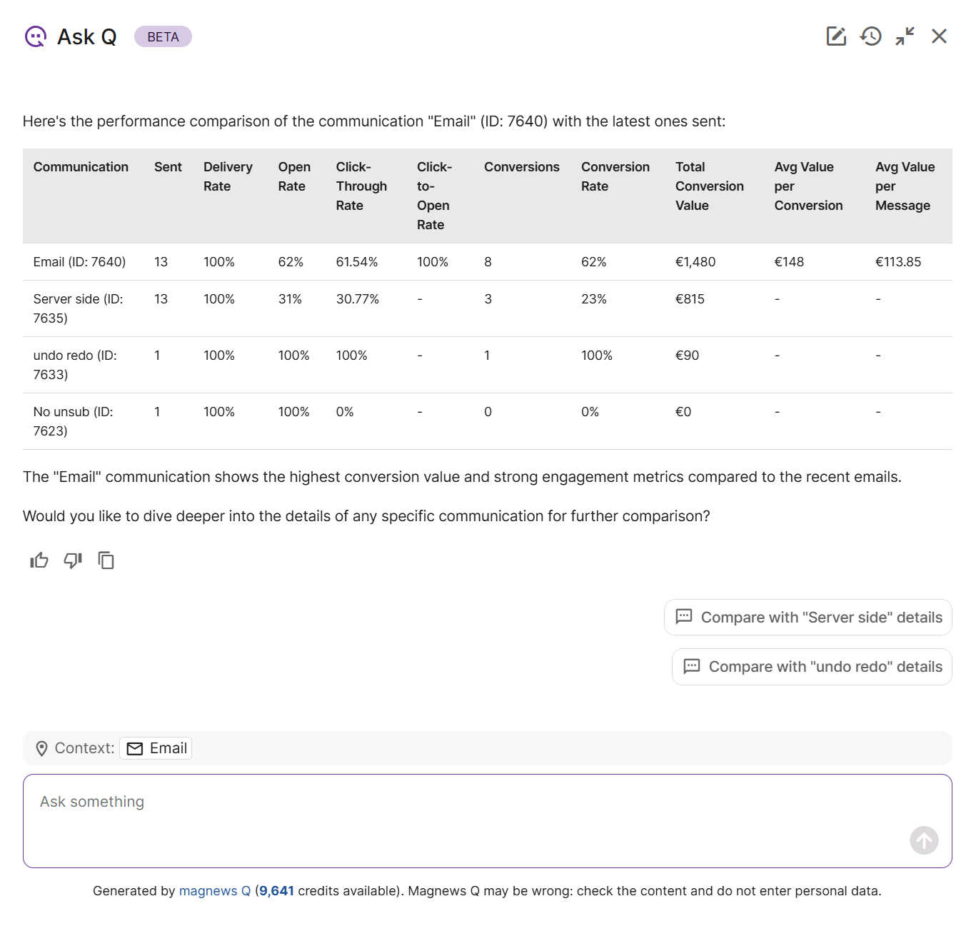 If you want a comparative view, Ask Q compares data across multiple communications, highlighting trends, differences, and anomalies that help you optimize your next campaigns.