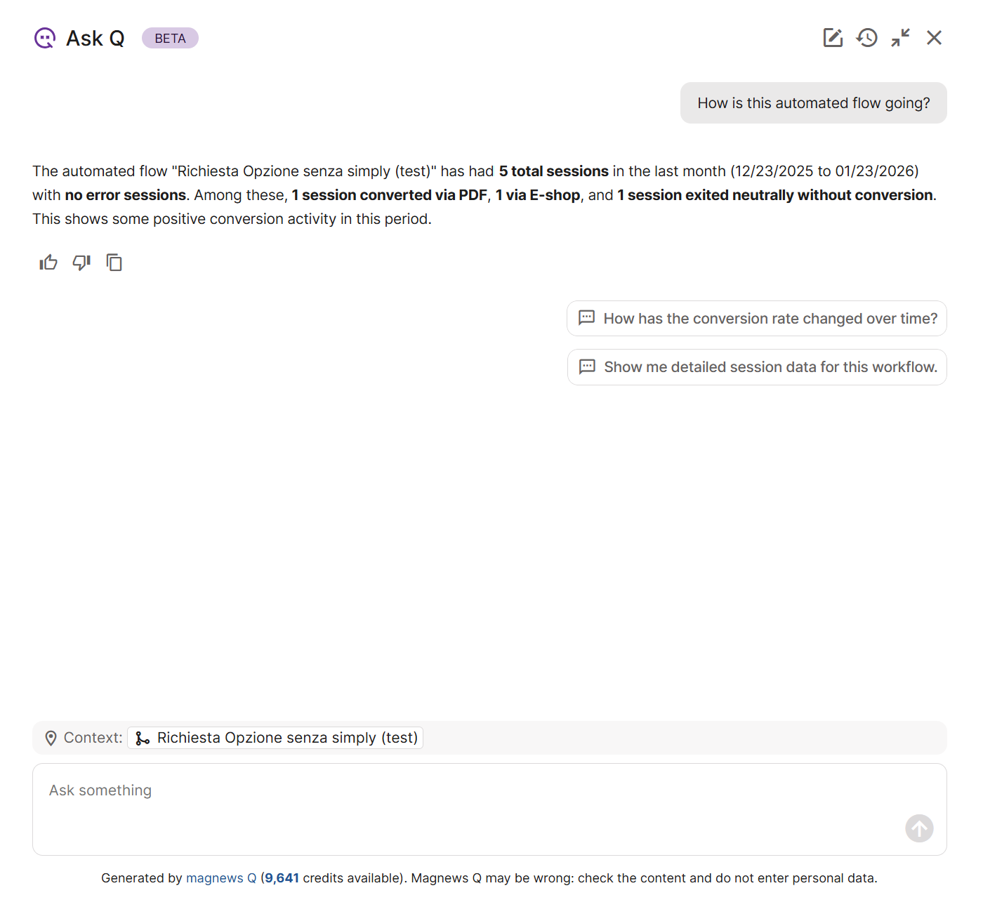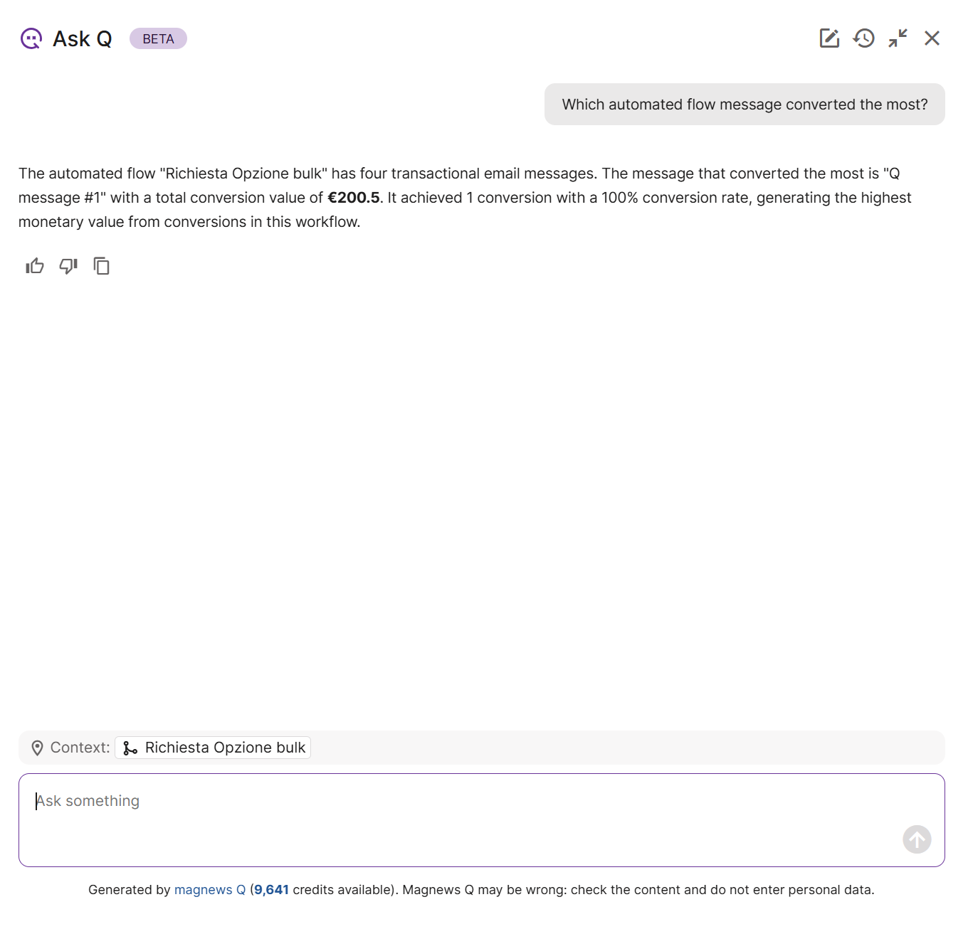 In the context of automated flows, Ask Q helps you quickly find the right information, monitor automation performance, and analyze the performance of transactional messages and conversions, without having to navigate across multiple views or reports.