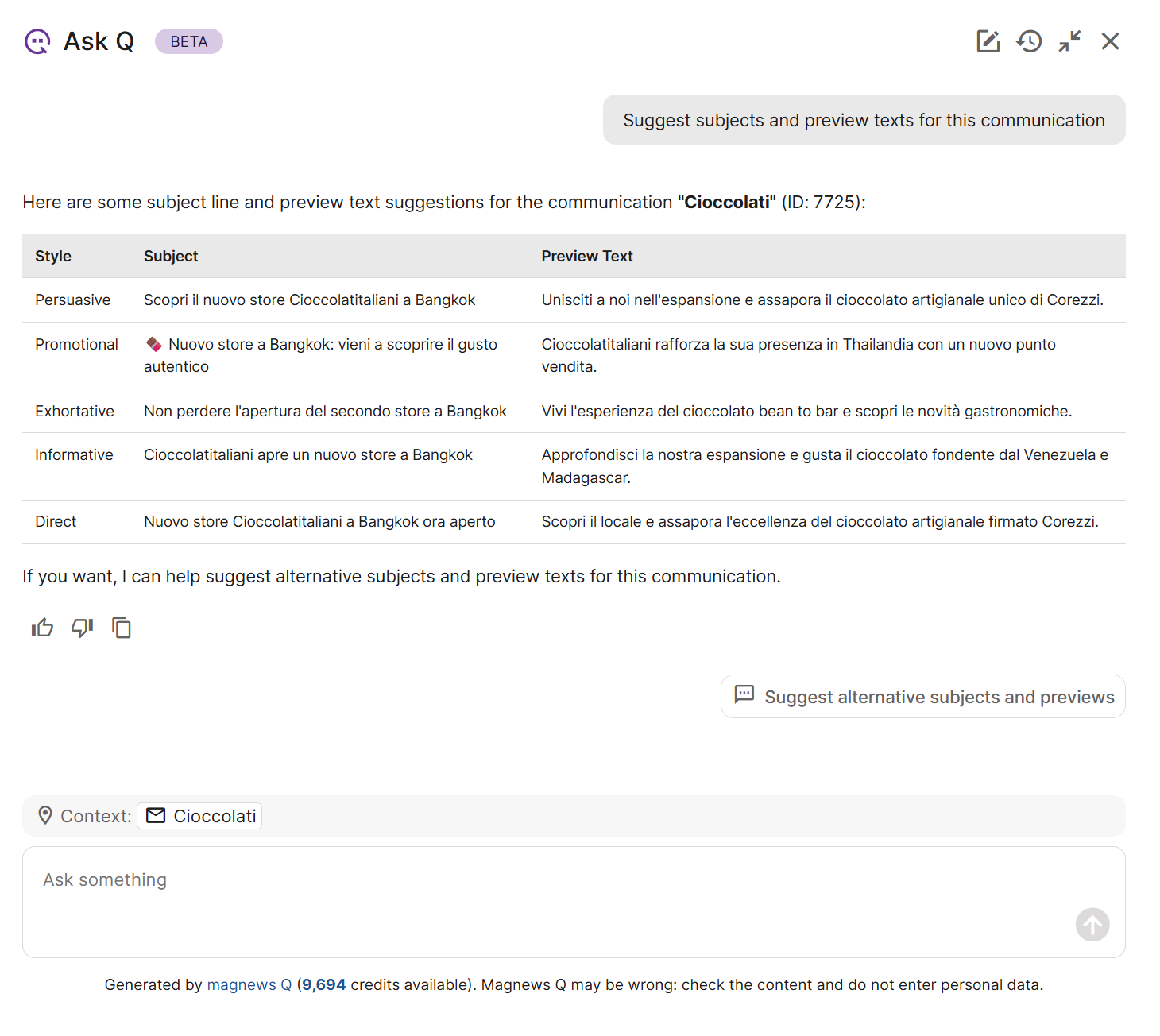 You can ask for suggestions to make your email subject or preview text more effective. The chat provides alternatives that are consistent with the actual content of the communication.