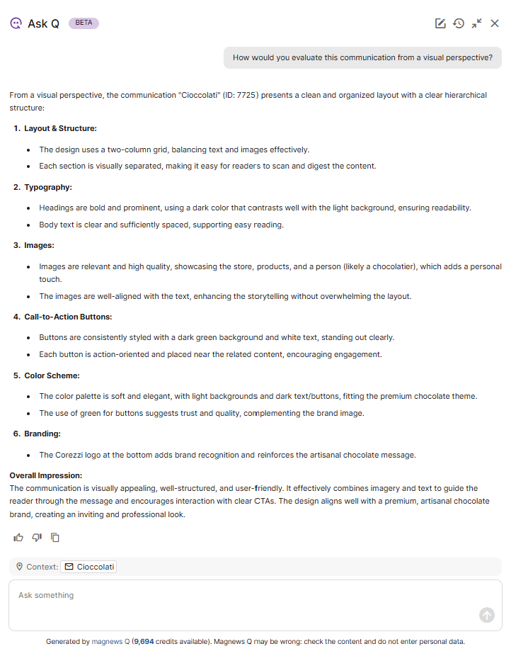 In this screen, the chat has access to the subject, preview text, and the textual and visual content of the communication. This means it can analyze the communication as a whole — content, structure, and layout — and help you optimize it without changing page or interrupting your flow.