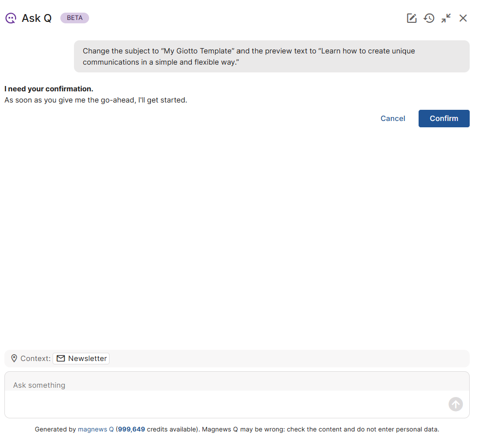 After receiving the suggestions, you can ask the chat to set the subject, preview text, or communication name; you’ll be asked for confirmation, and once approved, the change will be applied automatically.