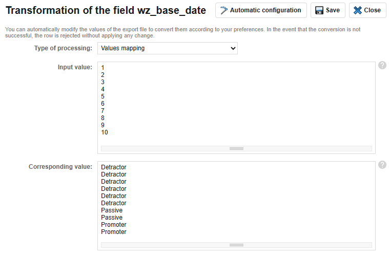 For example, for a Net Promoter Score (NPS) question, you could use the Value mapping option, where: for any answer from 1 to 6 you assign Detractor, for answers 7 or 8 Passive, and for 9 or 10 Promoter: