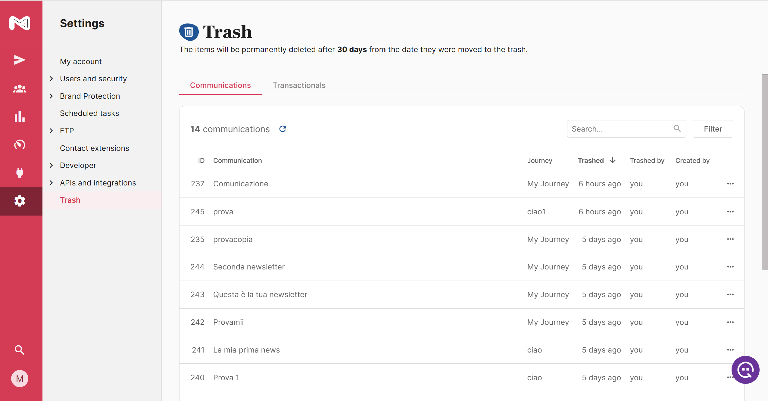 The trash is located in Settings - Trash, where you will find two main sections: one dedicated to communications and one to transactional.