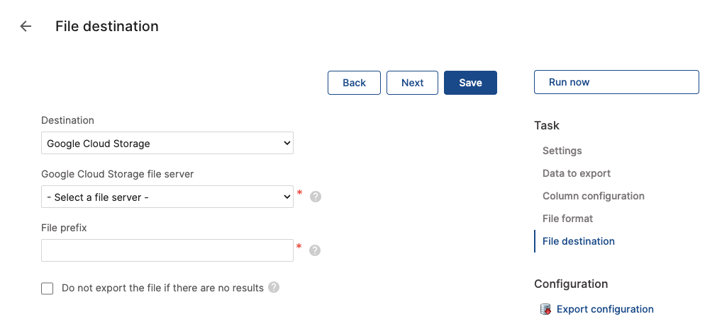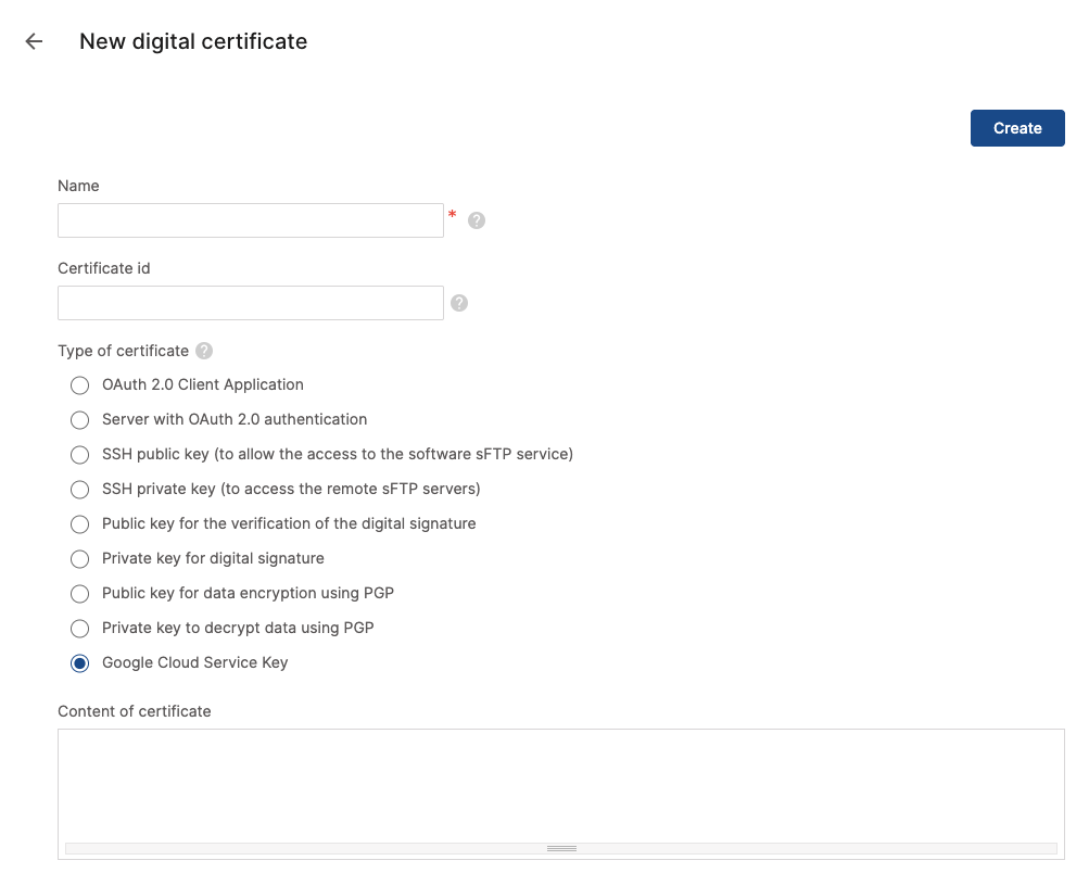 For this type of configuration, you do not need to fill in typical FTP or SFTP fields such as host, port, username, or password, because Google Cloud Storage uses a different authentication system.