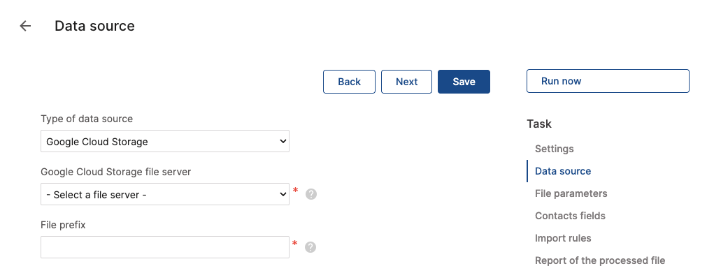 If you need to import contacts or data tables into magnews, in scheduled tasks you can select Google Cloud Storage as the data source by choosing the configured file server. This allows you to read files stored in the bucket and use them as the source for the import.
