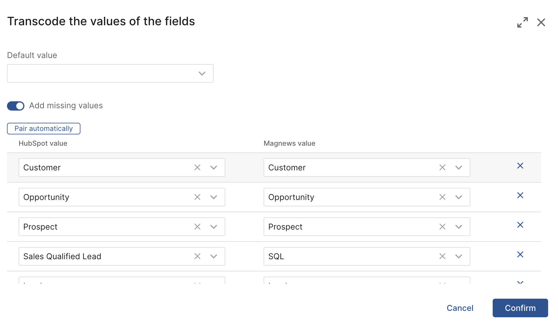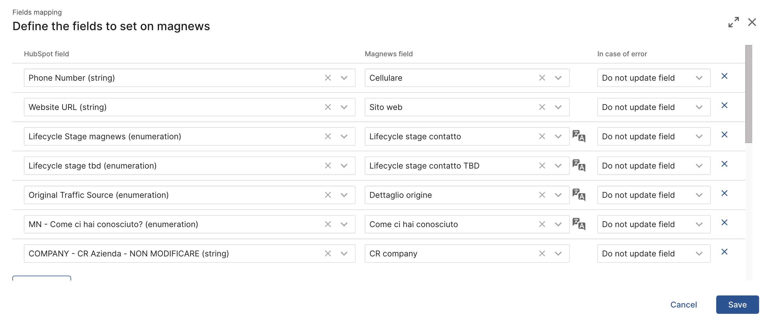 By enabling “Add missing values”: if a new value is introduced in HubSpot after the initial configuration, magnews automatically adds it to the field values using the same label.