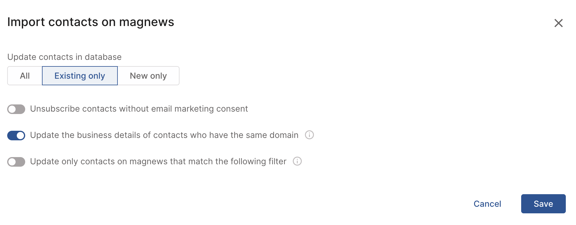 - Only existing contacts → only contacts already present in magnews are updated