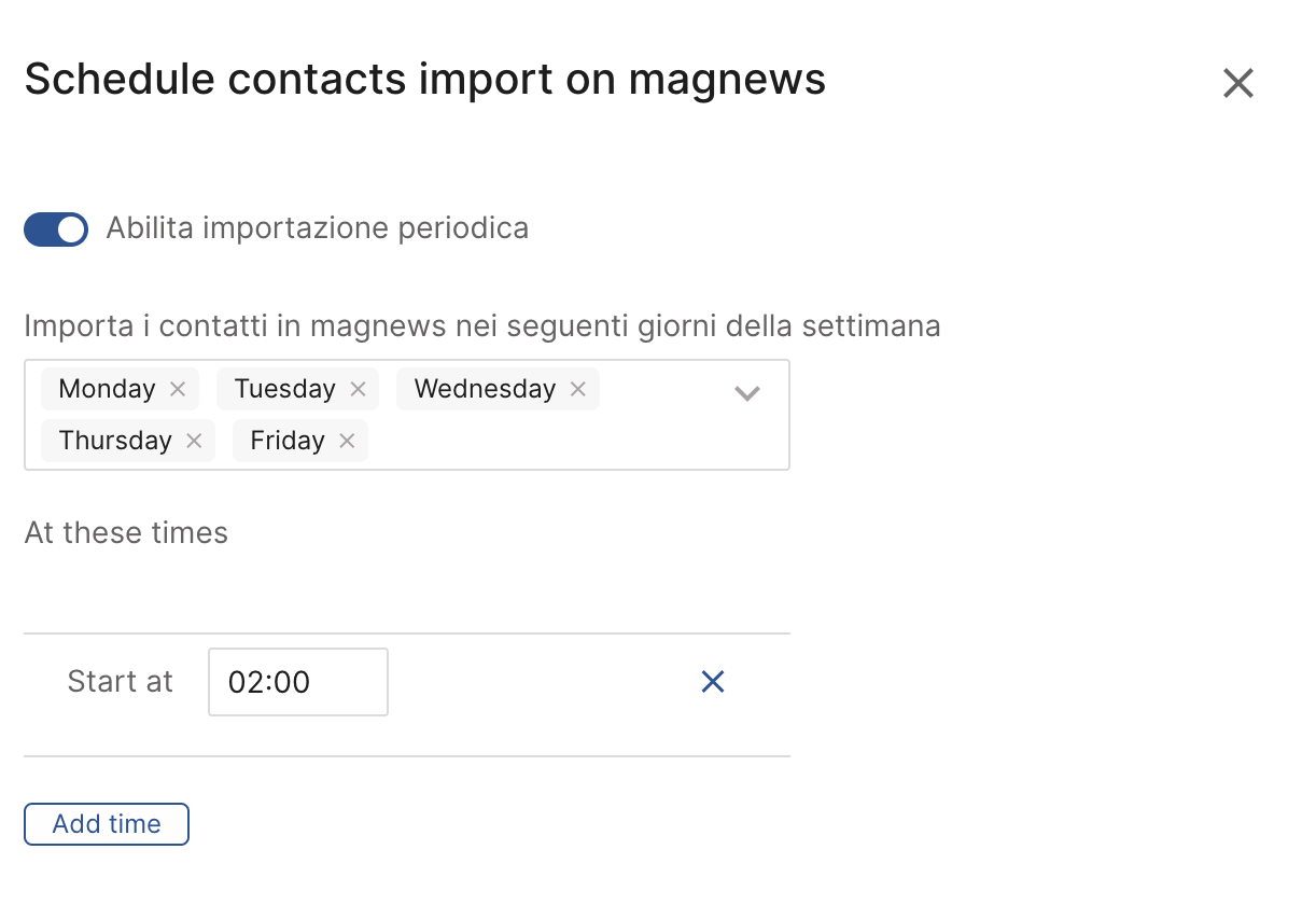 From the Contact import into magnews card, click Schedule to open the scheduling settings.