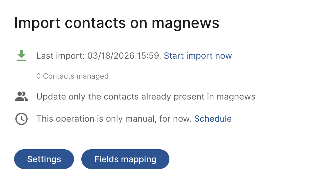 From the Import contacts on magnews card, you can manage all main operations.
