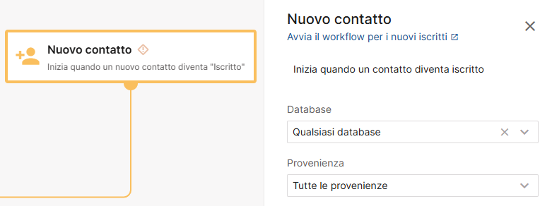 - Per esempio, potresti includere in un flusso di benvenuto solo i contatti che provengono dal form di iscrizione, selezionando la sorgente "Iscritto dal Web".